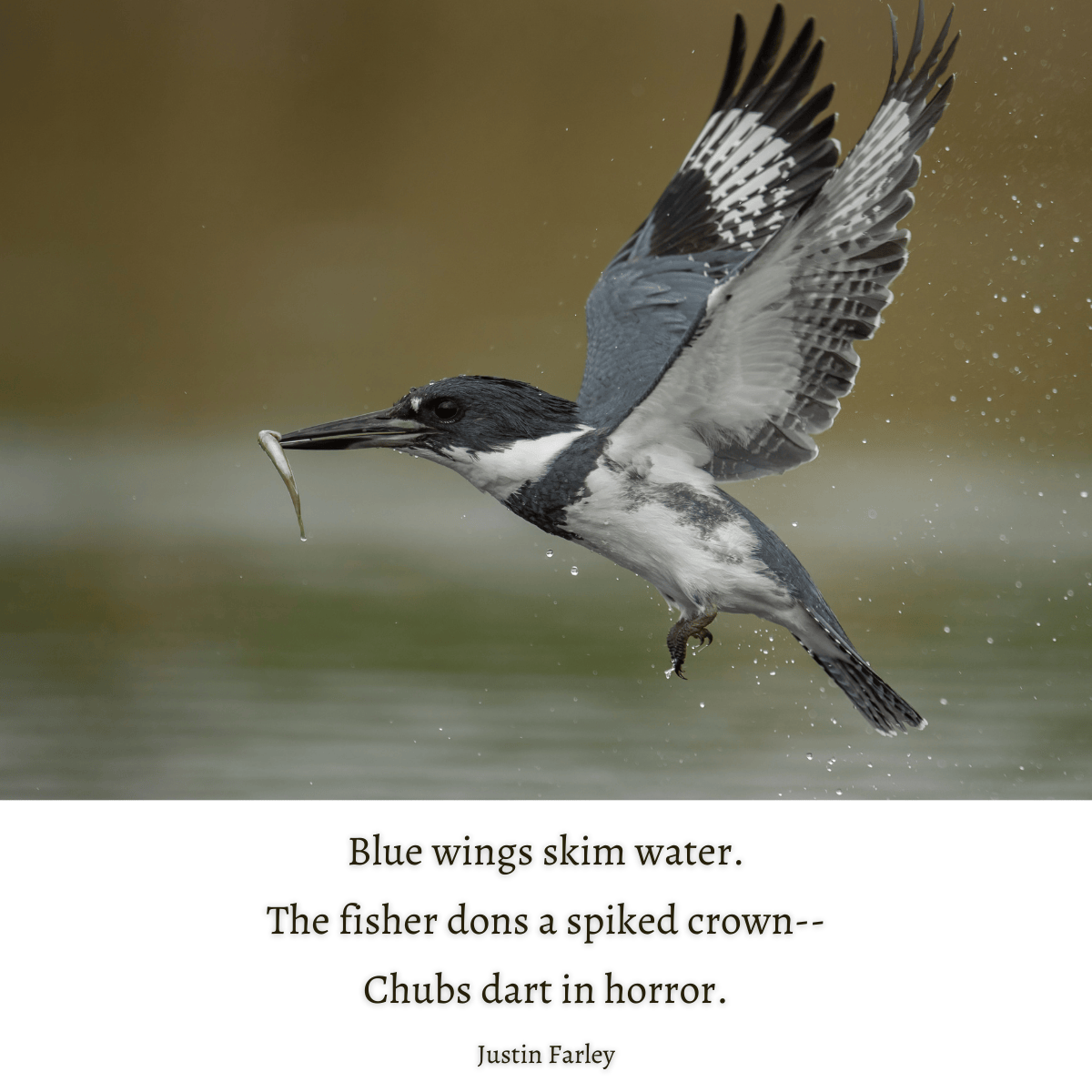 Some moments in nature are so special that remain in your memory long after you return to your everyday life. The belted kingfisher’s hunt is one of them—birds of blue-gray feathers and a spiked crest gliding over creeks and rivers, searching for fish below. I tried to capture the bird’s key features in this haiku: