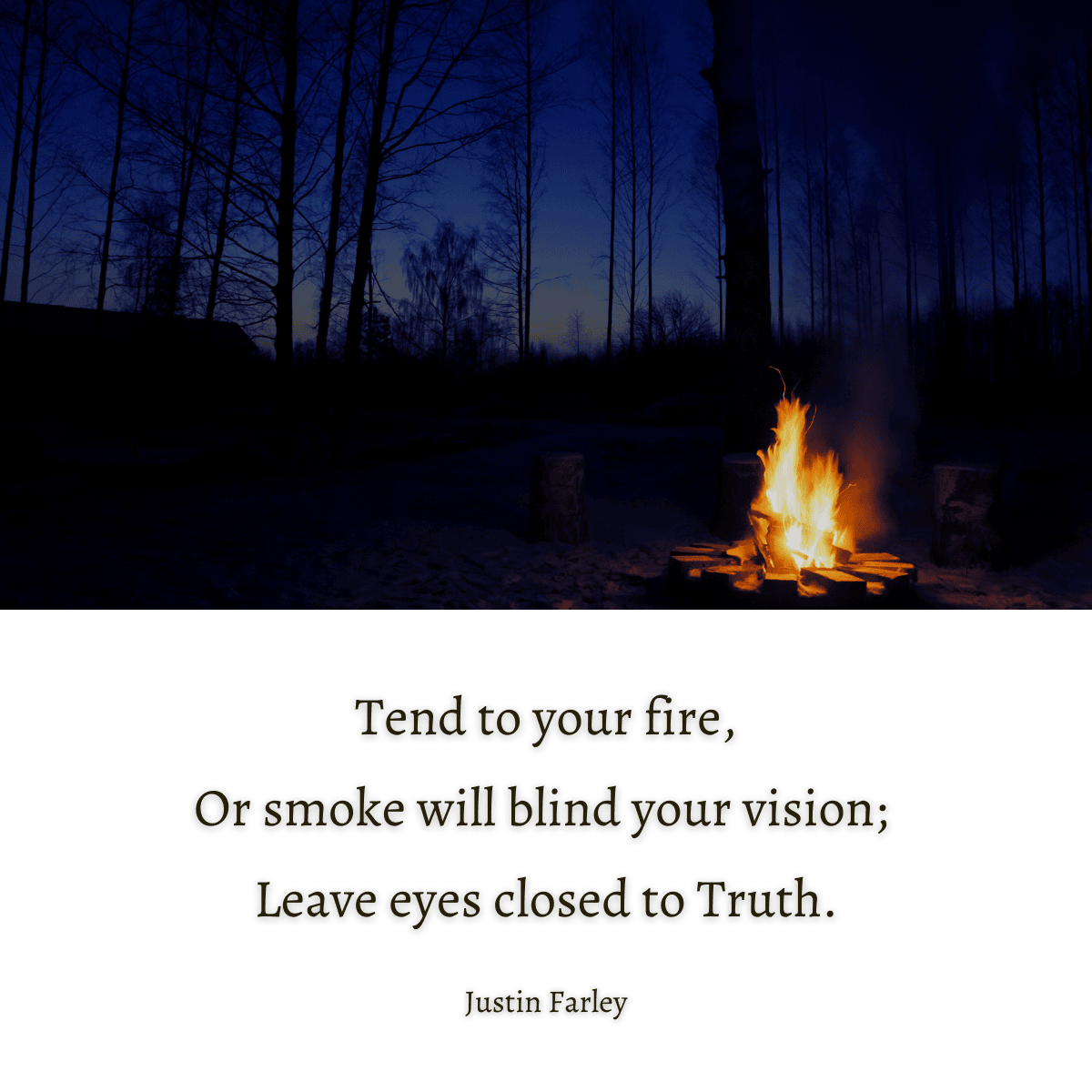 In the stillness of night, a fire burns beneath the open sky. It crackles gently, flames dance like whispers of a hidden revelation. As the darkness deepens, the air grows colder, and the necessity of tending this fire becomes clear. Neglect, even briefly, will let the flames dwindle until smoke replaces flame, leaving us cold and blind.
